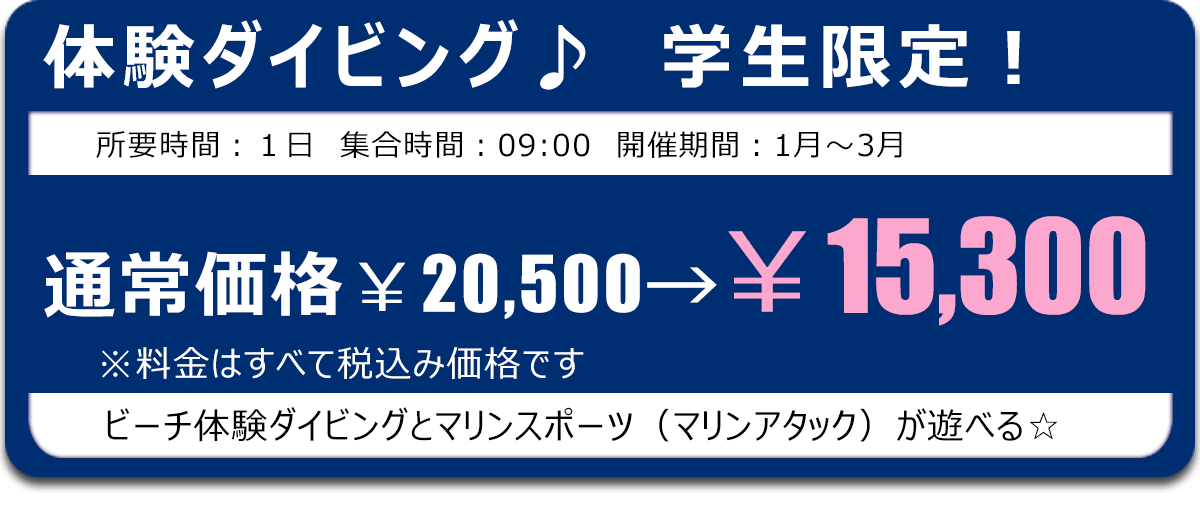 | コース名 | 学割セットコース (ビーチ体験ダイビング+絶叫マリンスポーツ4種目) |
